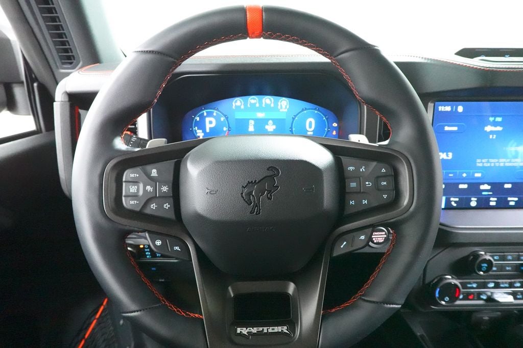 Gray 2026 Ford Bronco Raptor 4WD 10-Speed Automatic 3.0L EcoBoost V6 PANORAMIC ROOF, POWER MOONROOF, NAVIGATION, Bluetooth®, USB, APPLE CAR PLAY, ANDROID AUTO, REARVIEW CAMERA, ADAPTIVE CRUISE CONTROL, LANE DEPARTURE WARNING, REAR CROSS TRAFFICE ALERT, BLIND SPOT ALERT, AUTOMATIC EMERGENCY BRAKING, TRACTION CONTROL, REMOTE START, ALLOY WHEELS, HEATED STEERING WHEEL, HEATED FRONT SEATS, Equipment Group 374A Lux Package, Ford Connectivity Package (1-Year Included), Marine Grade Vinyl Bucket Seats, Navigation system: Connected Navigation, Radio: B&O Sound System by Bang and Olufsen, Wheels: 17 Black High Gloss-Painted Aluminum.