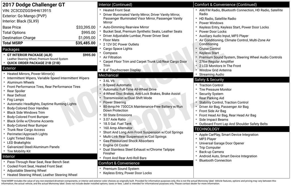 The GT Interior Package further enhances the Challenger's premium feel, with features like the 8.4-inch touchscreen display, Apple CarPlay, Android Auto, and a premium sound system. Enjoy the convenience of remote keyless entry, power windows, and steering wheel-mounted audio controls, all while staying connected with SiriusXM Satellite Radio and the Uconnect 4C infotainment system.