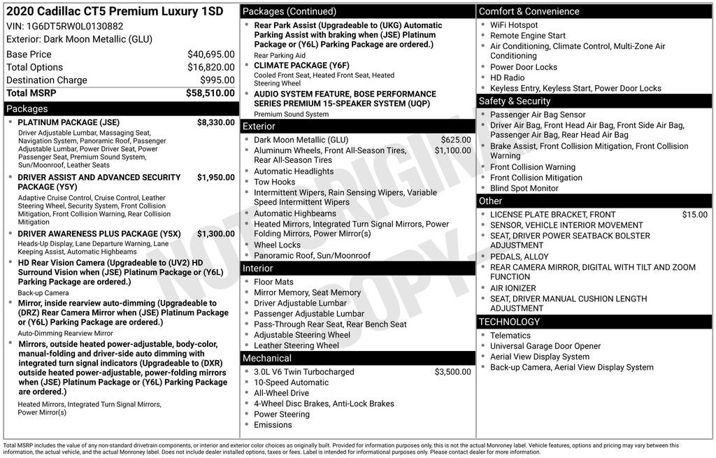 8 Diagonal Color Reconfigurable DIC Display, Advanced Adaptive Cruise Control, Air Ionizer, Alloy Pedals, Automatic Emergency Braking, Automatic Heated Steering Wheel, Automatic Parking Assist w/Braking, Automatic Seat Belt Tightening, Body-Color Heated Power-Adjustable Outside Mirrors, Body-Color Heated Pwr-Adjustable Outside Mirrors, Bose Performance Series Premium 15-Speaker System, Climate Package, Door Lock & Latch Shields, Driver Assist & Advanced Security Package, Driver Awareness Plus Package, Driver Manual Cushion Length Adjustment Seat, Driver Power Lumbar Massage Seat, Driver Power Seatback Bolster Adjustment, Dual Diagonal Color Driver Information Center, Enhanced Automatic Emergency Braking, Following Distance Indicator, Front Cornering Lamps, Front Passenger Manual Cushion Length Adjustment, Front Passenger Power Lumbar Massage Seat, Front Passenger Power Seatback Bolster Adjustment, Hands-Free Decklid Release, HD Rear Vision Camera, HD Surround Vision, Head-Up Display, Heated Driver & Front Passenger Seats, Illuminating Front Sill Plates, Inside Rear-View Auto-Dimming Mirror, IntelliBeam Automatic High Beam On/Off, Lane Keep Assist w/Lane Departure Warning, Leather Sport Thicker Rim Steering Wheel, Leather Wrapped Steering Wheel, LED Reflective Windshield Alert, Lighting Package, Locking Fuel Door, Locking Wheel Lugs, Manual Tilt & Telescoping Steering Column, Navigation & Bose Premium Audio Package, Parking Package, Platinum Package, Power Tilt & Telescoping Steering Column, Preferred Equipment Group 1SD, Radio: Cadillac User Experience w/Embedded Nav, Rear Camera Mirror, Rear Park Assist, Rear Pedestrian Alert, Reverse Automatic Braking, Self-Powered Shielded Theft-Deterrent Alarm System, Semi-Aniline Leather Seating Surfaces, SiriusXM Radio, Steering Column Lock Control, Steering Wheel Mounted Magnesium Paddle Shift Cntl, Steering Wheel Mounted Paddle Shift Controls, Surround Vision Recorder, UltraView Dual Pane Sunroof, Vehicle Inclination Sensor, Vehicle Interior Movement Sensor, Ventilated Driver & Front Passenger Seats.