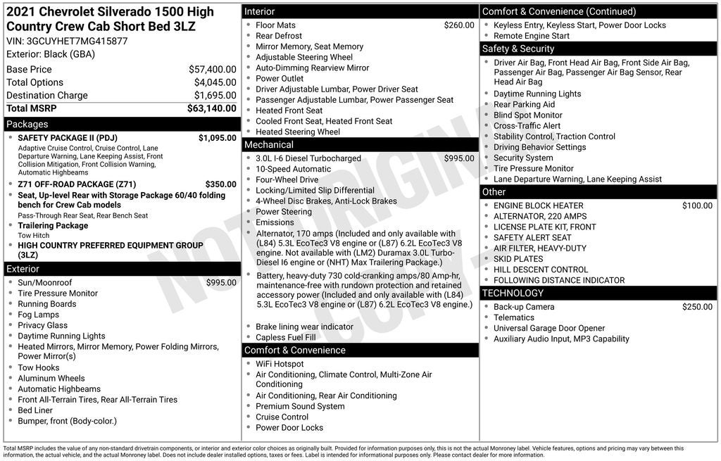 Elevate your driving experience with this exceptional 2021 Chevrolet Silverado 1500 High Country. Boasting a powerful 3.0L I6 Duramax Diesel engine, this truck delivers exceptional performance and efficiency, with an impressive 22 city/26 highway mpg rating. Adorned in a sleek Black exterior, this High Country model exudes a commanding presence on the road.