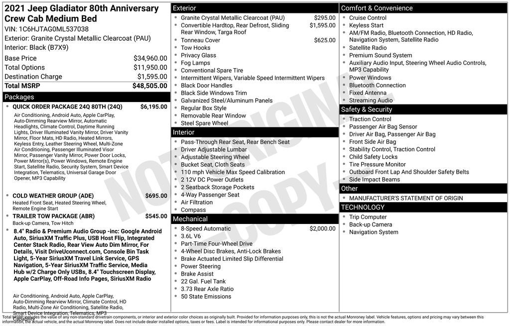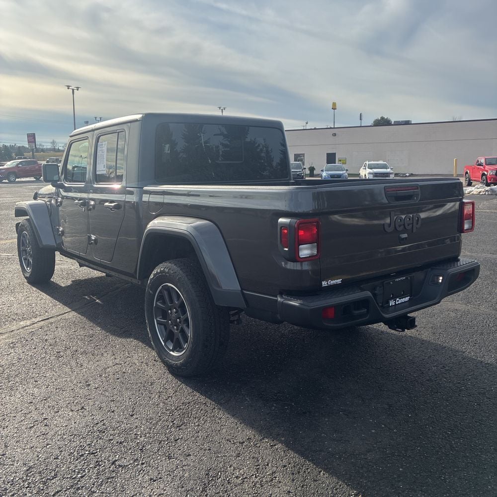 This Gladiator Sport also comes equipped with the Quick Order Package 24Q 80th, offering a wealth of premium amenities such as a Heated Steering Wheel, Remote Start System, and Heated Front Seats. The Mopar Soft Tri-Fold Tonneau Cover and Trailer Tow Package further enhance the vehicle's versatility and capability, making it the perfect companion for your next adventure.
