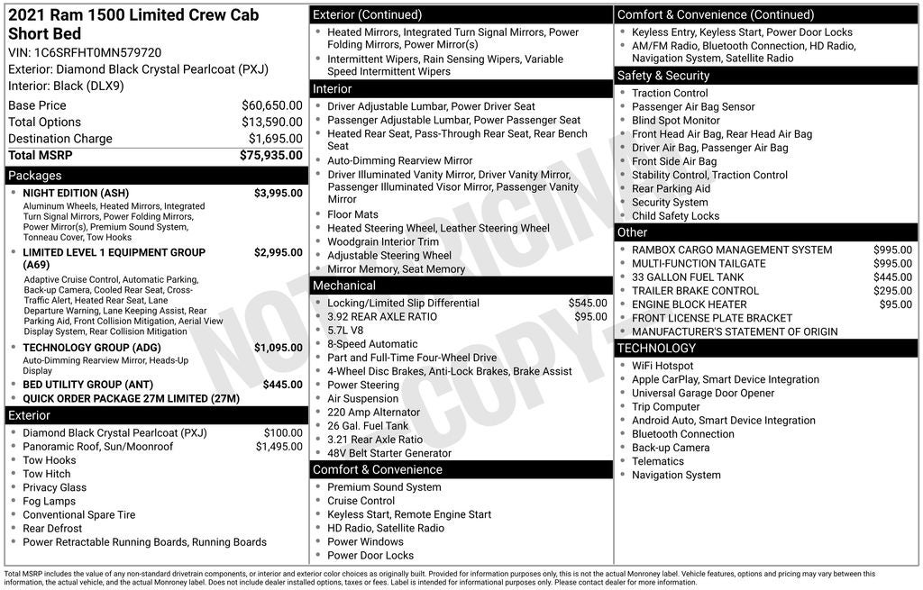 Accent Color Premium Power Mirrors, Adaptive Cruise Control w/Stop & Go, Bed Utility Group, Black Day Light Opening Moldings, Black Exterior Truck Badging, Black Grille Surround Texture 7 Chrome, Black Headlamp Bezels, Black Painted Exterior Mirrors Caps, Body Color Door Handles, Body Color Front Bumper, Body Color Rear Bumper w/Step Pads, Dual Exhaust w/Black Tips, GPS Navigation, harman/kardon 19 Speaker Premium Sound, Heads-Up Display, Lane Keep Assist, LED CHMSL Lamp, Limited Level 1 Equipment Group, MOPAR 4 Adjustable Cargo Tie-Down Hooks, MOPAR Deployable Bed Step, Navigation System, Night Edition, Parallel & Perp Park Assist w/Stop, Pedestrian Emergency Braking, Pick-Up Box Lighting, Quick Order Package 27M Limited, RAM Grille Badge - Black, Rearview Autodim Digital Display Mirror, Sport Performance Hood, Surround View Camera System, Technology Group, Tow Hooks, Tri-Fold Tonneau Cover, Ventilated Rear Seats, Wheels: 22 x 9 Black Aluminum.