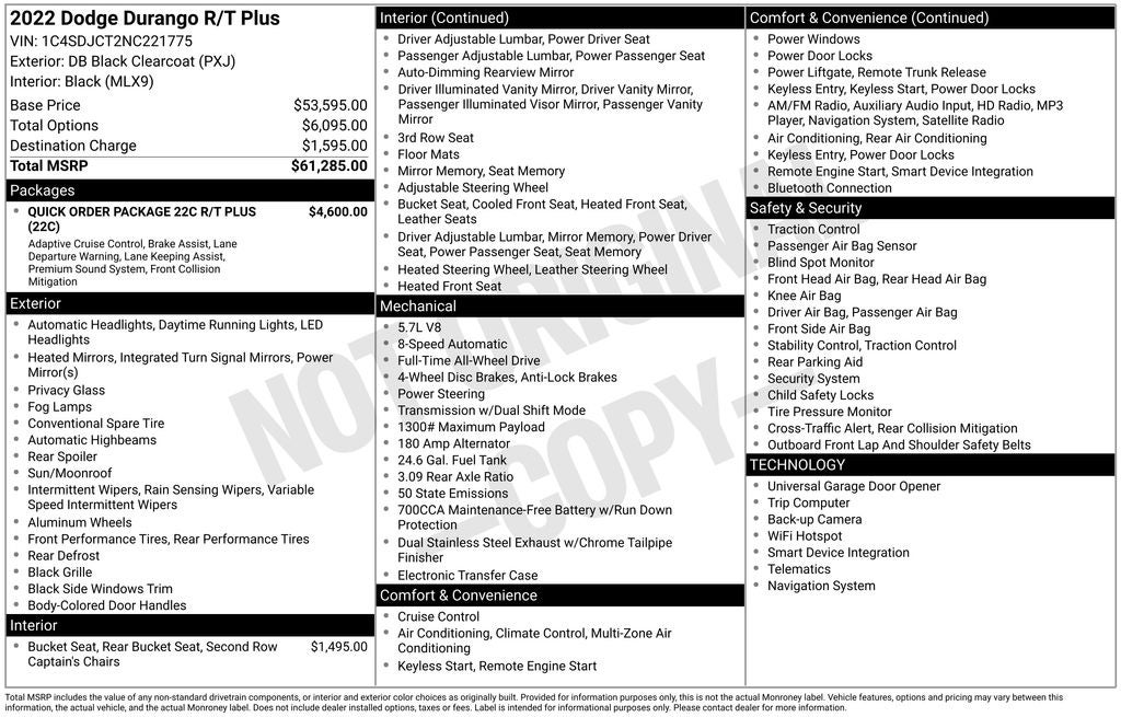 With its exceptional performance, uncompromising luxury, and comprehensive safety features, the 2022 Dodge Durango R/T Plus is the ultimate expression of SUV excellence. Experience the pinnacle of capability and comfort for yourself. Contact us today to schedule a test drive and discover why this Durango is the perfect companion for your next adventure.