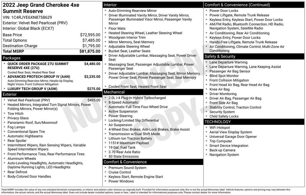 2.0L I4 DOHC, 4WD, 19 Speaker High Performance Audio, 2nd-Row Manual Window Shades, 3.70 Rear Axle Ratio, 4-Wheel Disc Brakes, 950 Watt Amplifier, ABS brakes, Active Cruise Control, Active Noise Control System, Adaptive suspension, Advanced Protech Group IV, Air Conditioning, Alloy wheels, Auto High-beam Headlights, Auto-leveling suspension, Brake assist, Compass, Deluxe Headliner, Electronic Stability Control, Front Center Armrest w/Storage, Front Passenger Interactive Display, Heads-Up Display, Heated front seats, Heavy Duty Suspension, Knee airbag, Low tire pressure warning, Luxury Tech Group V, Night Vision/Pedestrian-Animal Detection, Palermo Leather Door Trim, Palermo Leather Seats, Power driver seat, Power Liftgate, Quick Order Package 27T, Radio data system, Radio: Uconnect 5 Nav w/10.1 Display, Rain sensing wipers, Rear anti-roll bar, Rearview Autodim Digital Display Mirror, Remote keyless entry, Speed-Sensitive Wipers, Summit Reserve, Summit Reserve Badge, Traction control, Variably intermittent wipers, Ventilated front seats, Ventilated Rear Seats, Wheels: 21 x 9 Machined Face/Painted Aluminum, Wireless Charging Pad.