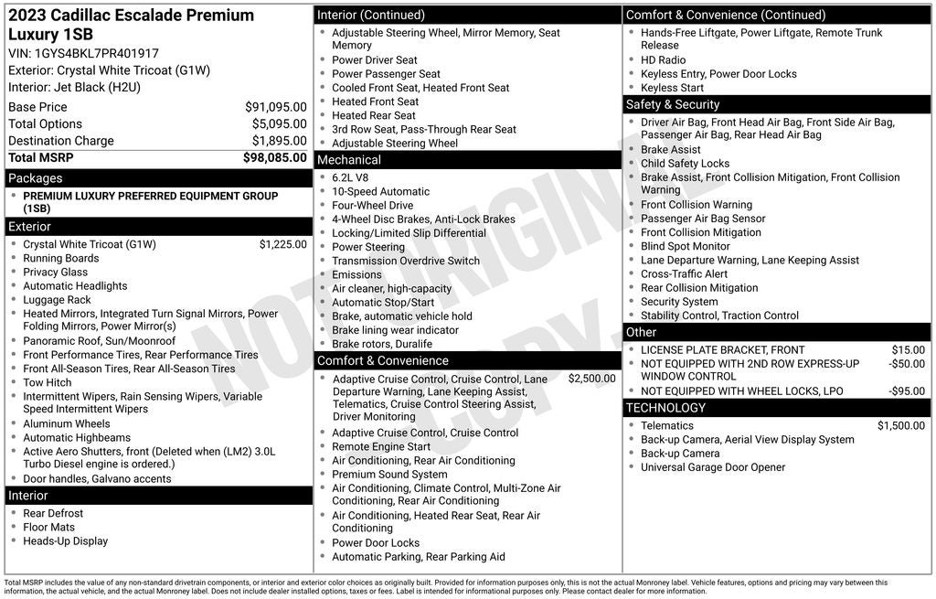 With a list price of $64,284, this 2023 Cadillac Escalade Premium Luxury represents exceptional value in the luxury SUV segment. Experience the pinnacle of refinement, technology, and performance by scheduling a test drive today. We're confident you'll be impressed by the unparalleled capabilities and luxurious amenities this Escalade has to offer.
