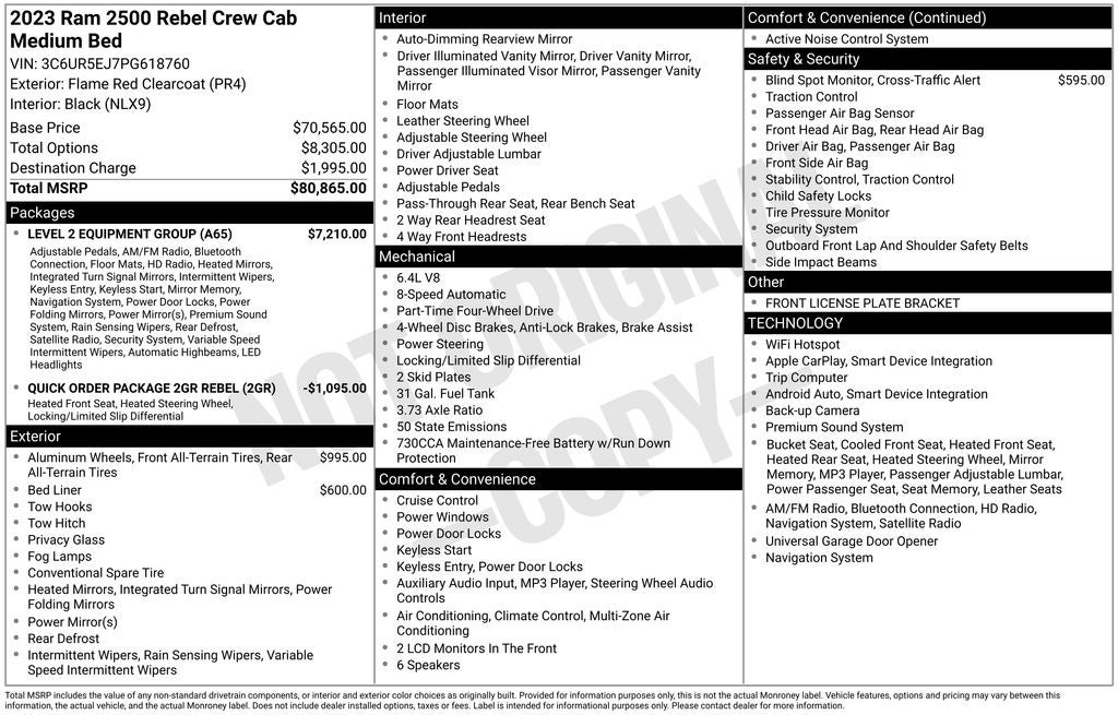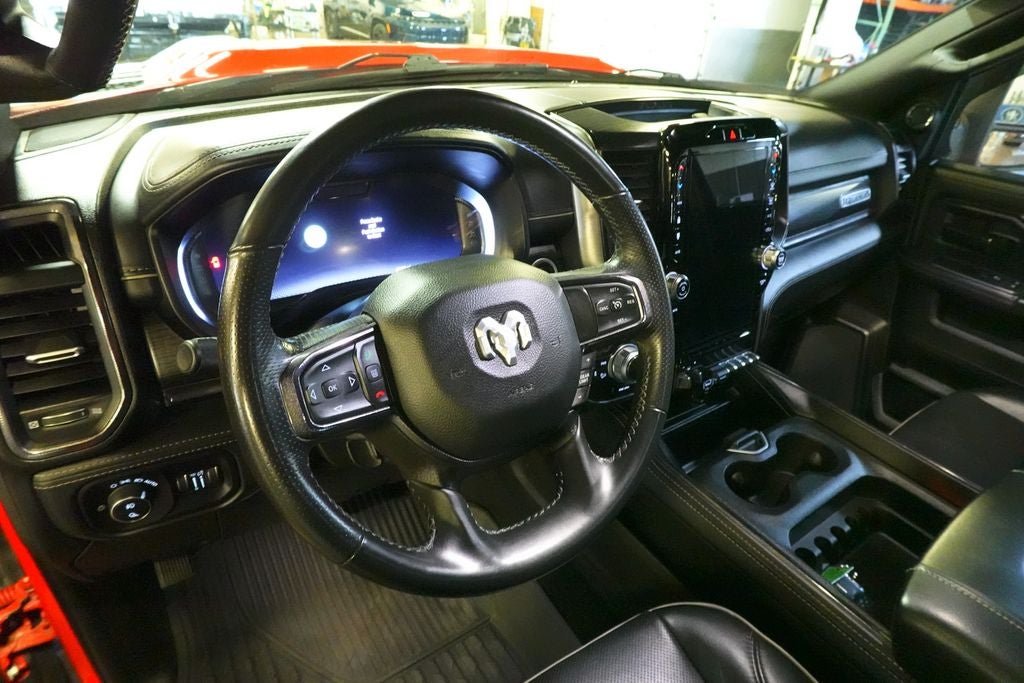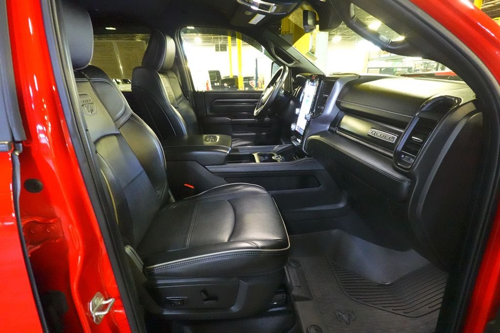 12 Touchscreen Display, 17 Speaker harman/kardon Premium Sound, 2 Way Rear Headrest Seat, 220 Amp Alternator, 4 Way Front Headrests, 40/20/40 Split Bench Seat, 4G LTE Wi-Fi Hot Spot, 4x4 Badge, Alexa Built-In, Aluminum Litho Instrument Panel Bezels w/Blk Trim, Apple CarPlay, Auto Adjust In Reverse Exterior Mirrors, Auto Dim Exterior Mirror, Auto High Beam Headlamp Control, Auto Power-Folding Mirrors, Auto-Dimming Exterior Passenger Mirror, Bi-Function LED Projector Headlamps, Black Exterior Mirrors, Black Rotary Shifter w/Silver Stripe, Black Wheel Center Hub, Body Color Door Handles, Cloth Power Bench Seat w/Emboss Tread Pattern (B9), Connected Travel & Traffic Services, Connectivity - US/Canada, Conventional Differential Front Axle, Disassociated Touchscreen Display, Electric Shift-On-The-Fly Transfer Case, Exterior Mirrors Courtesy Lamps, Exterior Mirrors w/Heating Element, Exterior Mirrors w/Memory, Exterior Mirrors w/Supplemental Signals, Folding Flat Load Floor Storage, For Details, Visit DriveUconnect.com, For More Info, Call 800-643-2112, Forward & Reverse Utility Lights, Front & Rear Floor Mats, Front Armrest w/Cupholders, Front Center Seat Cushion Storage, Front Door Accent Lighting, Global Telematics Box Module (TBM), Google Android Auto, GPS Antenna Input, GPS Navigation, HD Radio, Heated Front Seats, Heated Steering Wheel, High Back Seats, Integrated Voice Command w/Bluetooth®, Leather Wrapped Grab Handle, LED Dome Lamp w/On/Off Switch, LED Interior Lighting, Level 2 Equipment Group, Limited Slip Rear Differential w/Electronic Lock, Luxury Door Trim Panel (CTH), Manual Adjust 4-Way Front Passenger Seat, Mirror Running Lights, Navigation System, Off-Road Information Pages, Overhead LED Lamps, Painted Semi-Texture Film Instrument Panel Bezels, Power 2-Way Driver Lumbar Adjust, Power Adjust 8-Way Driver Seat, Power Adjust Mirrors, Power Adjustable Convex Aux Mirrors, Power Adjustable Pedals w/Memory, Power Heated Fold Telescopic Mirrors w/Memory, Power Telescoping Mirrors, Premium Overhead Console, Quick Order Package 2GR Rebel, Radio: Uconnect 5 Nav w/12.0 Display, Rain Sensitive Windshield Wipers, Rear 60/40 Folding Seat, Rear Door Accent Lighting, Rear Power Sliding Window, Rear Window Defroster, Remote Proximity Keyless Entry, Security Alarm, Selectable Tire Fill Alert, SiriusXM Radio Service, SiriusXM w/360L, Storage Tray, Trailer Tow Pages, Wheels: 18 x 8.0 Black Diamond Cut Aluminum.