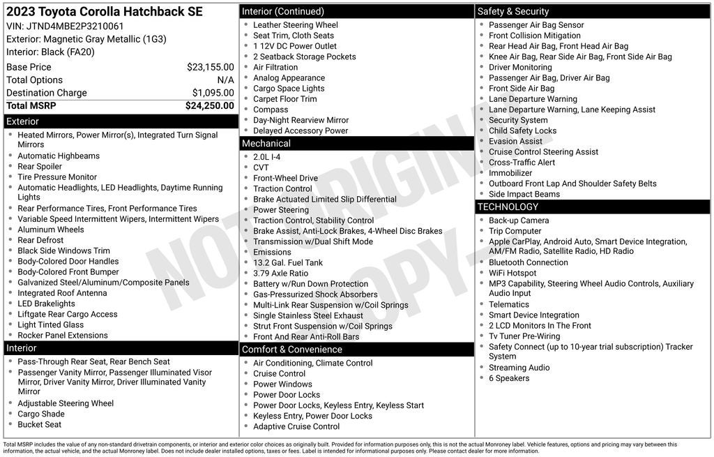 Boasting a sleek and modern exterior, the Corolla Hatchback SE commands attention on the road. Its striking gray finish and sporty silhouette exude a sense of sophistication and confidence. Under the hood, the 2.0L I4 engine and CVT transmission deliver an impressive 32 city/41 highway MPG, ensuring exceptional fuel efficiency to keep you on the move.