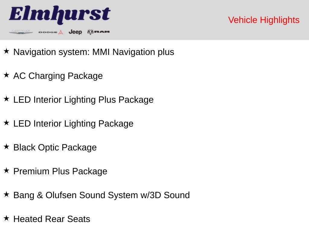 19.2 kW AC On-Board Charger, 2nd AC Charge Port (Passenger Side), AC Charging Package, Animation for Headlights & Taillights, Bang & Olufsen Sound System w/3D Sound, Black Optic Package, Black Roof Rails, Dual Pane Acoustic Glass for Side Door Windows, Front Passenger Power Lumbar, Heated Rear Seats, High-Gloss Black Front Grille & Mask, High-Gloss Black Rear Diffuser Inlay, High-Gloss Black Window Surrounds, Illuminated Front & Rear Aluminum Door Sill Inlays, LED Interior Lighting Package, LED Interior Lighting Plus Package, Matrix-Design LED Headlights, Navigation system: MMI Navigation plus, Premium Plus Package, Top View Camera System, Traffic Sign Recognition, Ventilated Front Seats, Wheels: 21 5-Arm Aero Structure Design, Wireless Phone Charging Pad.