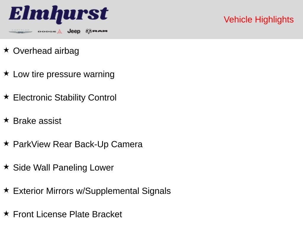 Safety is a top priority, with advanced features like ABS brakes, traction control, and electronic stability control ensuring a secure and confident driving experience. The ParkView Rear Back-Up Camera and overhead airbag further enhance your peace of mind.