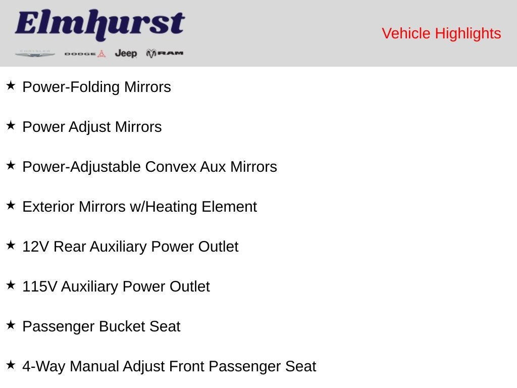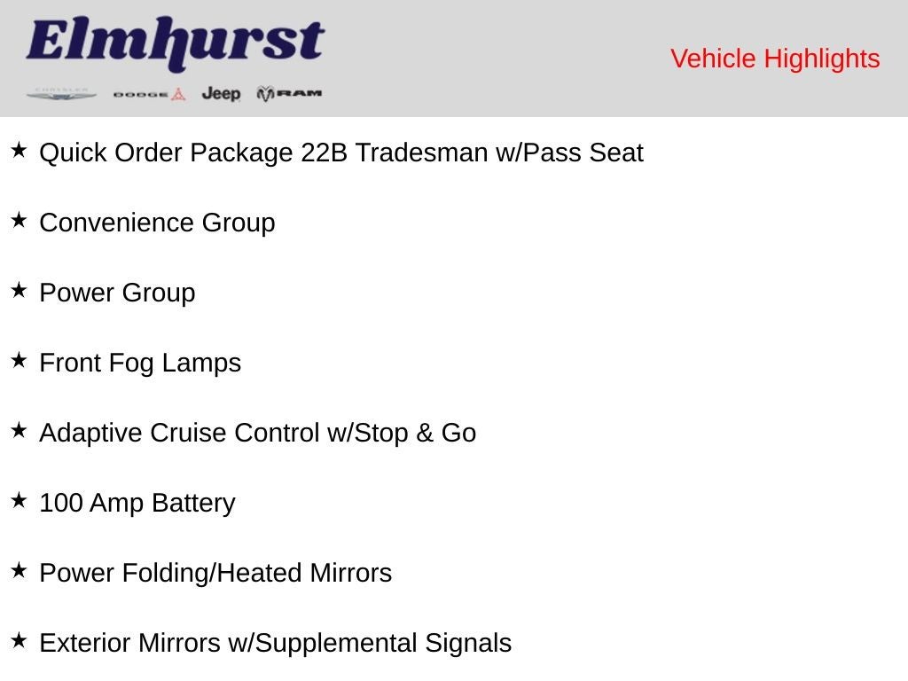 100 Amp Battery, 115V Auxiliary Power Outlet, 12V Rear Auxiliary Power Outlet, 4-Way Manual Adjust Front Passenger Seat, Adaptive Cruise Control w/Stop & Go, Convenience Group, Exterior Mirrors w/Heating Element, Exterior Mirrors w/Supplemental Signals, Front Fog Lamps, Passenger Bucket Seat, Power Adjust Mirrors, Power Folding/Heated Mirrors, Power Group, Power-Adjustable Convex Aux Mirrors, Power-Folding Mirrors, Quick Order Package 22B Tradesman w/Pass Seat, Rear Cargo LED Lamp.