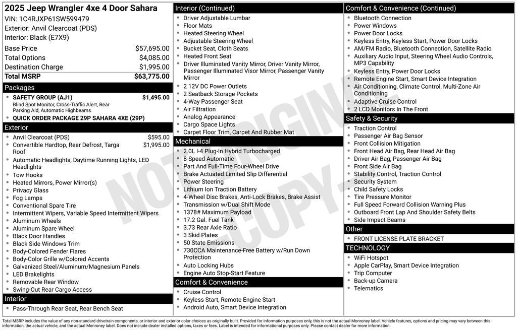2.0L I4 DOHC, Auto High Beam Headlamp Control, Blind Spot & Cross Path Detection, ParkSense Rear Park Assist System, Quick Order Package 29P Sahara 4xe, Safety Group.