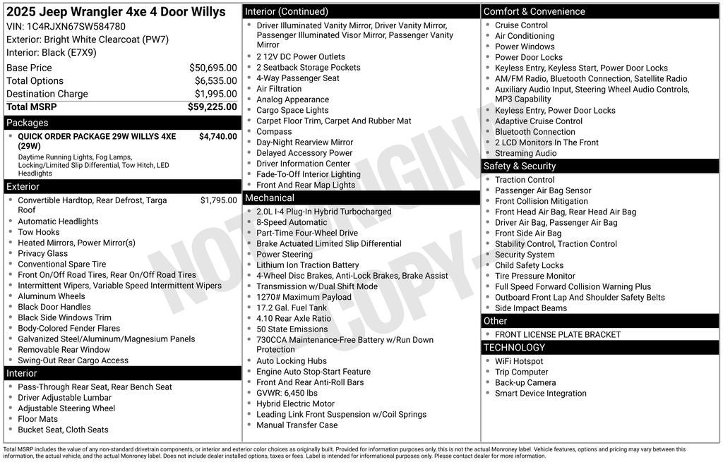 2.0L I4 DOHC, 4-Wheel Drive Swing Gate Decal, 4.10 Rear Axle Ratio, 7 & 4 Pin Wiring Harness, 97 MPH Vehicle Max Speed Calibration, Auxiliary Switches, Black Grille, Class II Receiver Hitch, Conventional Differential Front Axle, E-Locker Rear Axle, Front LED Fog Lamps, LED Premium Reflector Headlamps, Molded in Color Rubicon Highline Flare, MOPAR All-Weather Floor Mats, Off-Road Plus Mode, Quick Order Package 29W Willys 4xe, Wheels: 17 x 7.5 Painted Black, Willy's Suspension, Willys 4xe Hood Decal.